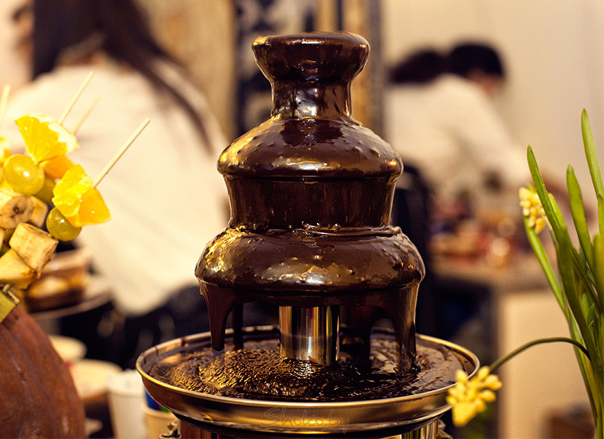 Шоколадные фонтаны были почти на каждом столе и шоколад лился реками, водопадами и ручейками.