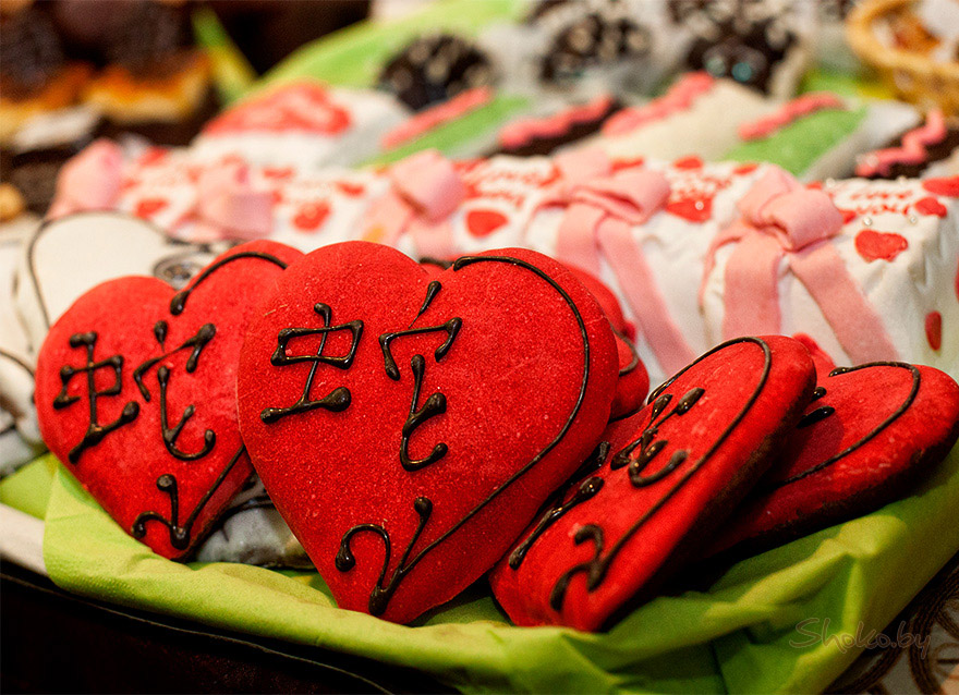 Шоколадные сердечки с пожеланиями для влюблённых на загадочном языке.