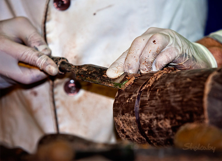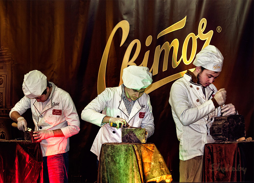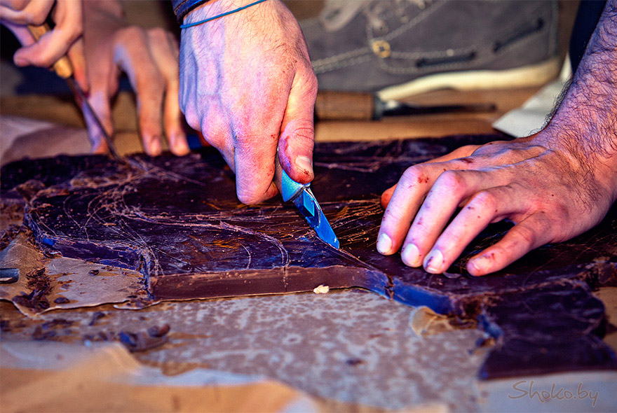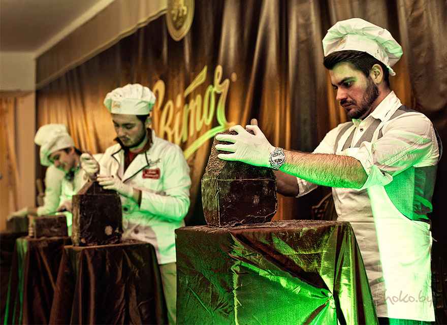 Шоколатье за работой, создают скульптуры из больших кусков шоколада.