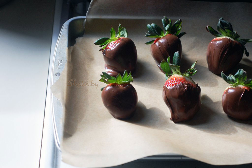 Поместите клубнику в шоколаде на противень, застеленный пергаментной бумагой для выпечки. Подождите, пока шоколад на клубнике полностью застынет. Для более быстрого застывания шоколада можете поместить противень в холодильник.