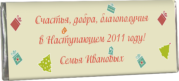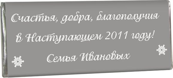Мы предлагаем Вам разнообразить этот Новый год и удивить своих гостей, подарив им эксклюзивные Новогодние шоколадки от Вашей семьи. Также можно необычно украсить елку новогодним шоколадом. |